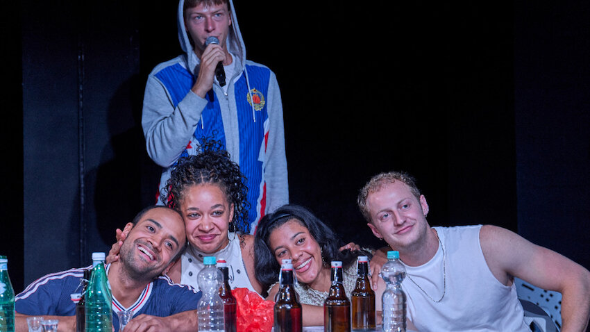 Regisseur Gerhardt, der zuvor erfolgreich in der Neuköllner Oper „Tanatas Teeschale“ auf die Bühne brachte, auch da unter anderem bereits mit einer umwerfenden Azaria Dowuona-Hammond (mehr dazu in der Bühnenkritik Nr. 510 vom 24. Februar 2025), beweist erneut einen guten Draht zu jungen Darstellern, alle fünf Studierende im vierten Jahrgang und mit unterschiedlichen kulturellen Wurzeln, wenn auch nicht vom Balkan. Man spürt: Sie wissen, was sie da spielen, in einer Mischung aus jugendlicher Coolness und Nachdenklichkeit.