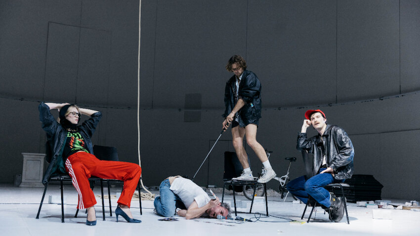 In den Reclamheft-Atrappen, die mich an menschliche Werbeträger für Hamburger erinnerten, sich mir in ihrer Funktion ansonsten nicht erschlossen, stecken Andri Schenardi als Franz Moor, Janek Maudrich als Karl Moor, Mathilda Switala als Amalia und Moritz Kienemann als Spiegelberg und somit Vertreter der Räuberbande. Mehr ist von der Personage bei Schiller nicht übriggeblieben. Und von Schiller selbst auch nicht viel.