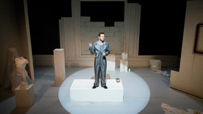 Hinten eine Mauer, aus der Steine herausgebrochen sind, an einer Wand ein Bilderrahmen, im Raum verteilt Skulpturen, alles verhüllt. Quader, auf denen vielleicht mal Exponate standen. Ein fast leerer Wasserkanister. Die Szenerie real und surreal zugleich. Die vorherrschende Farbe Weiß konterkariert die Düsternis. Links steht ein Klavier (Bühne und Kostüm: Janina Kuhlmann).