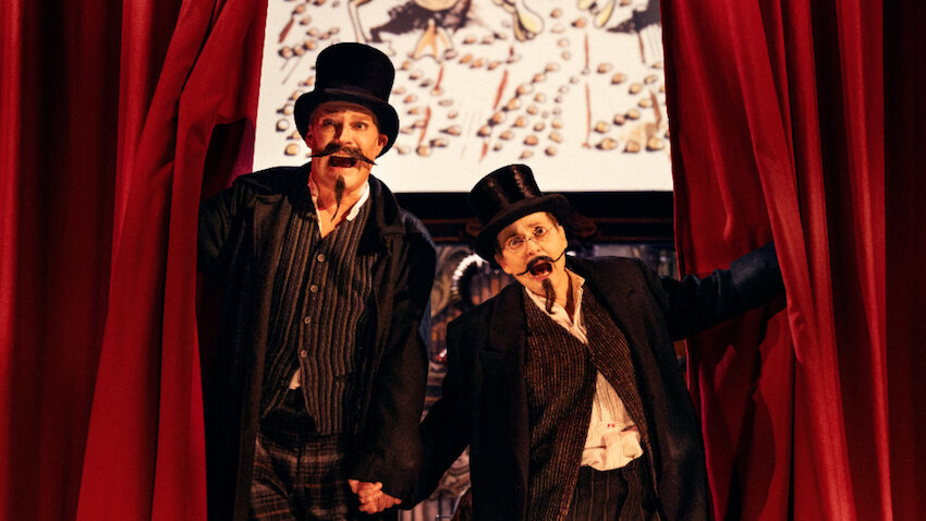 Für die Ausstattung sorgen Kollegen, die am selben Ort bereits an der Erfolgskomödie „Carmen darf nicht platzen“ mitstrickten (mehr dazu in der Bühnenkritik Nr. 534 vom 10. November 2025). Momme Röhrbein lässt das Bühnenbild passend zu Wilhelm Busch wie Zeichnungen erscheinen, ebenso „überzeichnet“ wirken die Kostüme von Angelika Rieck.