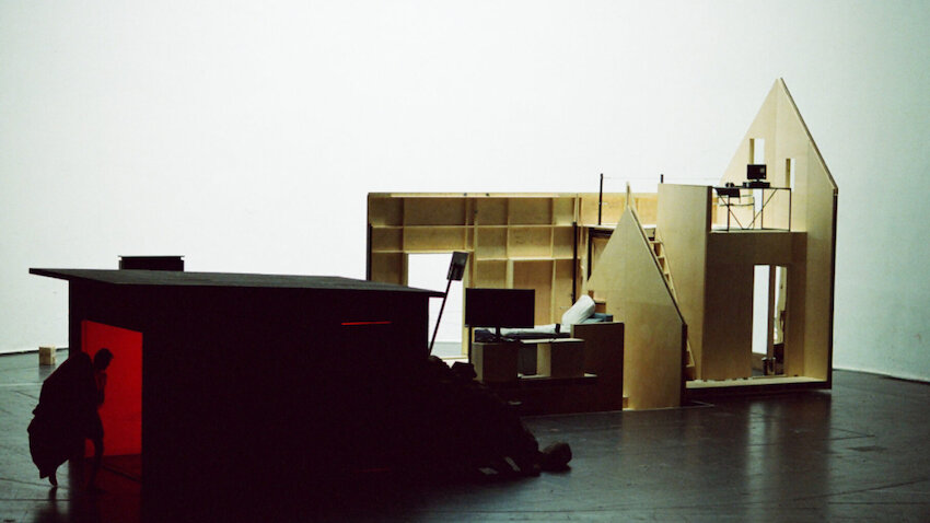 Wenn später der eiserne Vorhang hochgegangen ist, steht auf der Bühne ein Haus mit Keller, Erdgeschoss mit Küche und Bad, oben Schlafzimmer und Dachboden. Die Ebenen verschieben sich, manchmal ist der Keller weg, manchmal der Boden. Das Dach öffnet sich mal, dann senkt es sich wieder. Neben dem Haus ist noch ein Schuppen, der in rotes Licht getaucht ist, wenn die Bühnen sich gedreht hat. Davor ein Haufen Steine, in dem eine Schippe steckt.