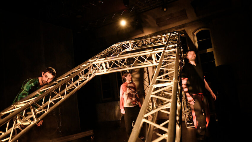 Zwei parallele Traversen aus Metall laufen schräg nach oben auf eine dritte zu, die beide auf einer Höhe von bestimmt drei Metern verbindet. Auf diesem Gerüst bewegen sich die Drei, klettern, balancieren, hangeln sich von Strebe zu Strebe, drohen abzustürzen, halten einander.