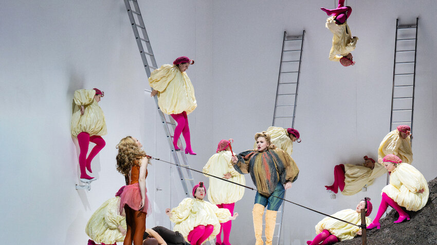 Das ist alles mit atemlosem Tempo in Szene gesetzt. Ein Feuerwerk an Gags, das bei der Premiere für kreischenden Jubel sorgt wie bei einem Sport-Event. Großartige Sängerdarstellerinnen und -darsteller hat die Deutsche Oper hier zur Verfügung. In der Titelpartie, eine Rolle für Mezzosopran, die momentan heiß gehandelte Nadezhda Karyazina, die ebenso beeindruckende Präsenz hinterlässt wie der venezianische Bariton Tommaso Barea als Mustafá und bei seinem Hausdebüt der junge US-amerikanische Tenor Jonah Hoskins als Spargeltarzan Lindoro. Selbst die begeisternden Koloraturen werden fast parodistisch überzogen. Den komischen Vogel schießt der voluminöse Buffo Misha Kiria ab als unglücklich liebender Taddeo. Dirigent Alessandro De Marchi, der bei den absichtlich chaotischen Ensemble-Szenen im Wrestling-Studio aufpassen muss, dass er nicht selber in den Seilen hängt, macht mit dem Orchester der Deutschen Oper das Spiel der Überzeichnungen mit. Sogar das Hammerklavier des Basso Continuo greift manchmal mit Absicht daneben. Was am meisten zählt, sind Lacher.