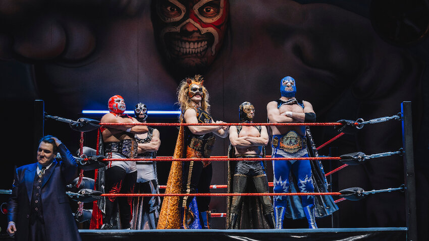 Das Einmalige an der Inszenierung ist die Besinnung auf „Lucha libre“, die mexikanische Variante des Kampfschausports Wrestling. Hier gelingt es, dieses Spektakel mit seinen Masken und bunten Kostümen auf der Bühne von Harald Thor stilecht mit der Opernkomödie zu verbinden, indem der Regisseur mit Rossini in den Ring steigt. Unterstützt von echten Kämpfern, die mitunter auf die Seile klettern und mit großem Rumms auf den Brettern landen. Mustafá, genannt der „Bey“, ist hier nicht Herr übers Serail, sondern ein ehemaliger Champion. Mit Hilfe des mafiosen Haly hat er sämtliche Muckibuden seines „algerischen Viertels“ an sich gerissen und so ein Sport-Imperium aufgebaut. Seinen Konkurrenten Lindoro aus dem „italienischen Viertel“ zwang er durch ein Duell in seine Gewalt, er muss nun für ihn in einem Taco-Imbiss kellnern.