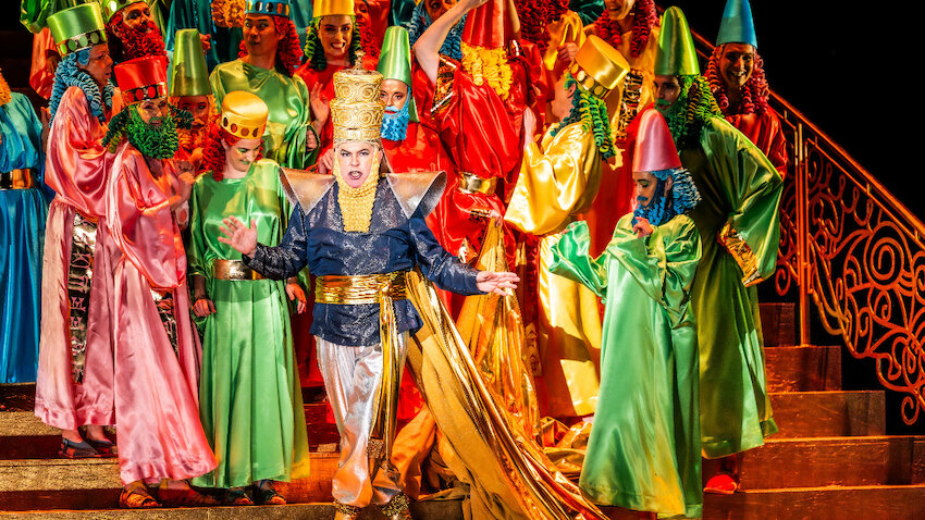 Herbert rockt Händel. Das fröhliche Enfant terrible Herbert Fritsch macht sich diesmal über ein Oratorium her: „Belshazzar“. Georg Friedrich Händel vertonte den Text seines Stammlibrettisten Charles Jennens 1744/45, die Uraufführung in London geriet für den finanziell angeschlagenen Theaterunternehmer Händel zum Misserfolg. An der Komischen Oper erzählt nun Fritsch die Geschichte vom babylonischen König. Berauscht von Macht und Wein verhöhnt Belshazzar (Robert Murray) den Gott der Juden, die in seinem Weltreich gefangen sind. Als auf der Wand das berühmte Menetekel erscheint, ahnt seine Mutter Nitocris (Soraya Mafi) das böse Ende. Die Prophezeiung erfüllt sich, Assyrer und Perser stürmen den Palast, der rücksichtslose Herrscher fällt in der Schlacht, sein Reich wird aufgeteilt und die Juden können aus dem Exil zurückkehren.