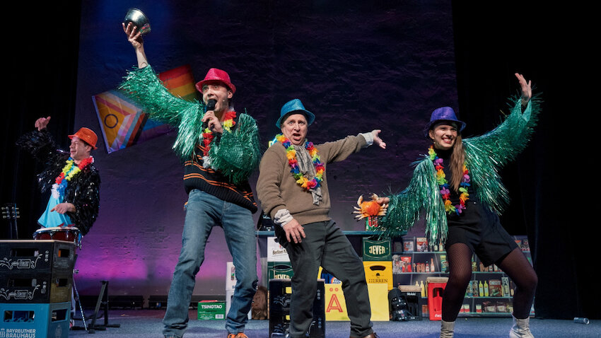Für den Distel-Stammgast ist einiges neu. Kein Musikduo als Begleitung, die besorgt das Quartett auf der Bühne diesmal selber. Fast durchweg bislang unbekannte Gesichter, aber von umwerfend komischem Talent, die in Lilian Laeticia Haacks schwungvoller Regie selbst aus ärmeren Pointen reiche Ernte ziehen. Mimt Jens Bache zunächst den Späti-Gastgeber Wolle, so bilden Josepha Grünberger als feministische Influencerin und Karsten Kramer als auf sein analoges Dasein pochender Professor weltanschauliche Gegenpole. Bei ihrem Streit übers Gendern ergreift bei der Premiere das Publikum lautstark Partei für die jeweilige Position.