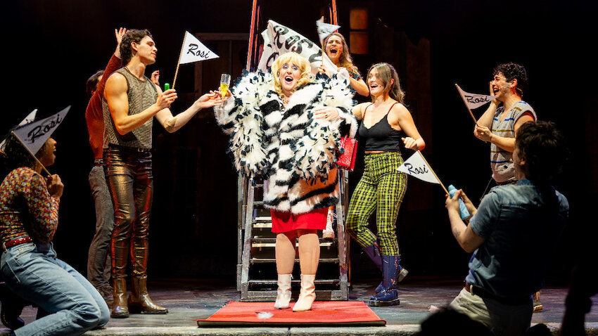 Es gibt niederschmetternde Momente, doch die Lebenslust setzt sich durch. Dank der bis in kleine Rollen rasanten Besetzung, den tollen Choreografien (Jonathan Huor), in der mittels Drehbühne sogar das Konsum-Gebäude mittanzt. Auch durch den satirischen Witz: Kathi Damerow gibt wunderbar trullig die alternative Weltverbesserin in der Kommune. Den komischen Vogel schießt jedoch erneut Steffi Irmen ab. Der Publikumsliebling (mehr dazu in der Bühnenkritik Nr. 525 vom 9. Juni 2025) begeistert diesmal mit blonder Fönfrisur als Ninas und Marios Mutter Rosi Fröhlich, die ihren Friseursalon („Kati Witt, das war der schärfste Schnitt“) schließen musste.